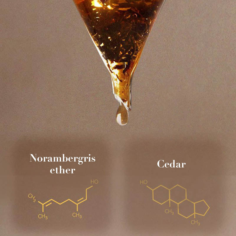 Kasvi EXTRAKTTEJA: Luonnollisilla ekstrakteilla, kuten kedrillä ja norambregris-eetterillä, täytetty tämä parfyymi antaa rikkaan, maallisen aromin, joka lisää sofistikointia ja syvyyttä tuoksuun.